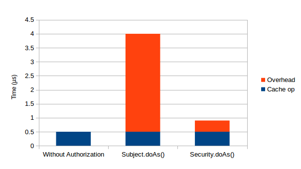 Previously we mentioned the need to use a SecurityManager and javax.security.auth.Subject.doAs() in order to achieve authorization in embedded mode. Unfortunately those components have a severe performance impact. In particular, retrieving the current Subject from the AccessControlContext adds, on my test environment, 3.5µs per call. Since the execution of a Cache.put takes about 0.5µs when authorization is not in use, this means that every invocation is 8x slower.