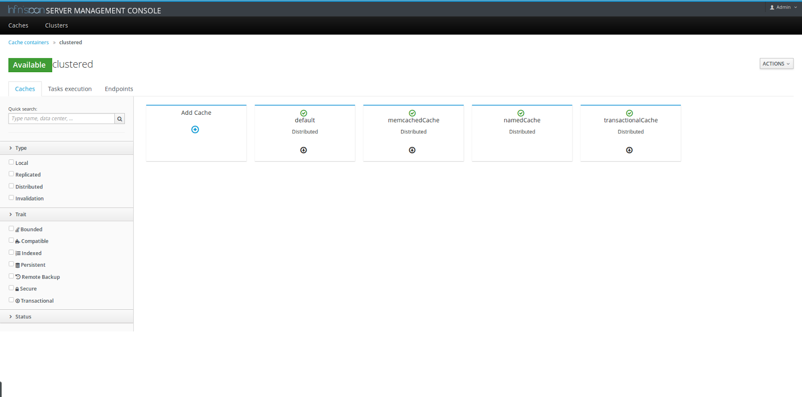 The first Beta release of Infinispan 8.1 is now available for use. Our new admin console has gone through quite a lot of changes recently. As mentioned before the new console allows for administration of Infinispan cluster nodes and now we would like to show some screenshots of a running server in the below gallery.